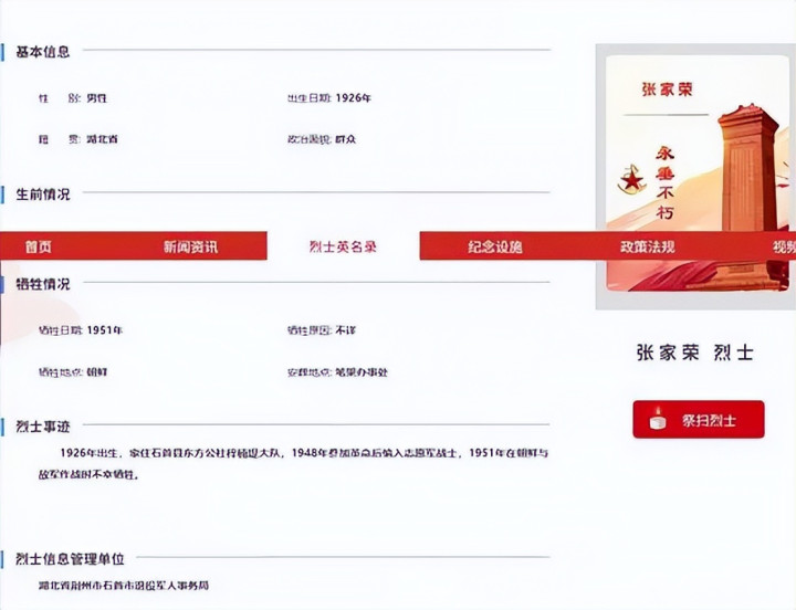 我认为,在发动群众和依靠组织推进寻亲工作的同时,还应当努力寻找一些重点线索,重点寻找。这两天,我在两网查找张家云烈士信息的过程中,发现了一位张家荣烈士,也是石首市人,具体地址是石首县东方公社梓楠堤大队(现为石首市东升镇梓楠堤村);也是抗美援朝牺牲的,但牺牲的时间是1951年,但部队番号、牺牲原因、牺牲地点不详。